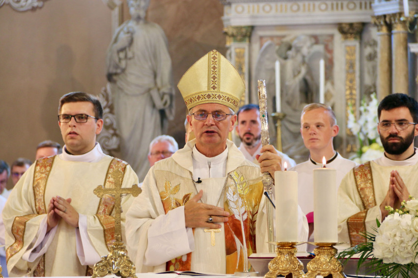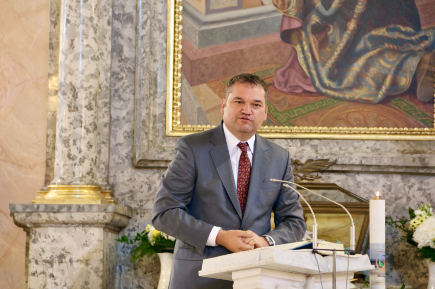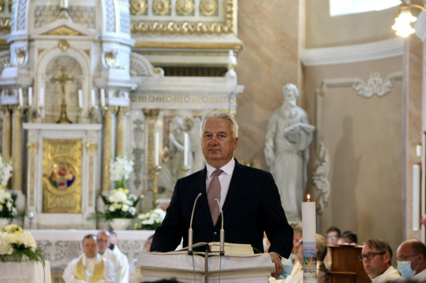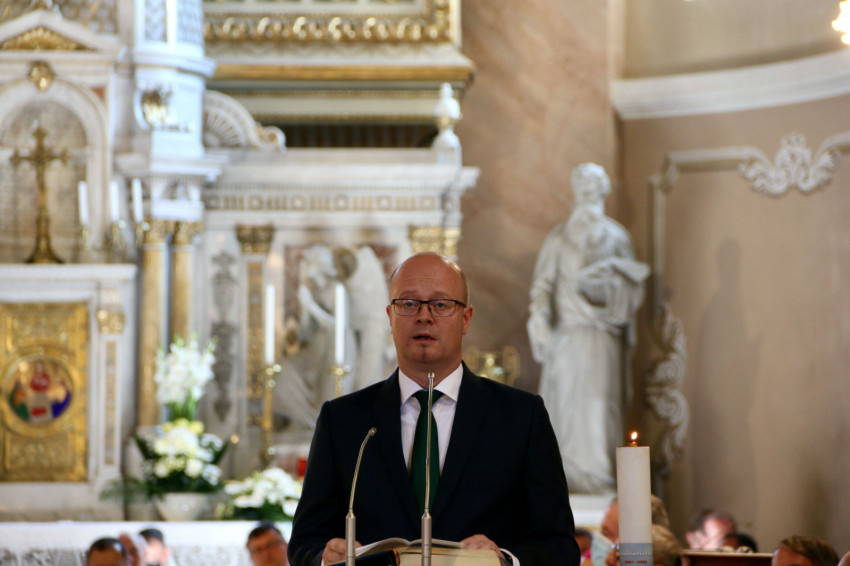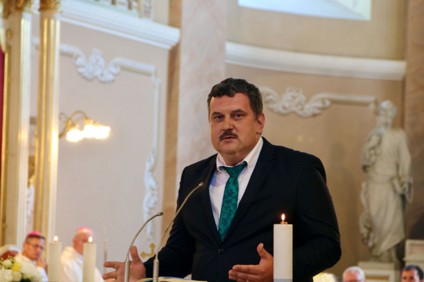 Semjén Zsolt, Magyarország miniszterelnök-helyettese az egyházmegye fővédőszentje, a tegnap ünnepelt Szent István király életpéldájára irányította az ünneplő hívek figyelmét: „Államalapító királyunk élete végén az országot és a Szent Koronát Szűz Máriának ajánlotta fel, és arra hívott mindannyiunkat, hogy népünk történetét üdvtörténetté formáljuk” – mondta. Büszkén említette, hogy az első királyunk egyházszervezői munkája által létrehozott egyházmegyék ezer év múltán is fennmaradtak. Szent királyunk elrendelte azt is, hogy tíz falunként építsenek egy templomot. Magyarország kormánya az elmúlt tíz évben több mint háromezer templomot újított fel és több mint száz újat épített a Kárpát-medencében.