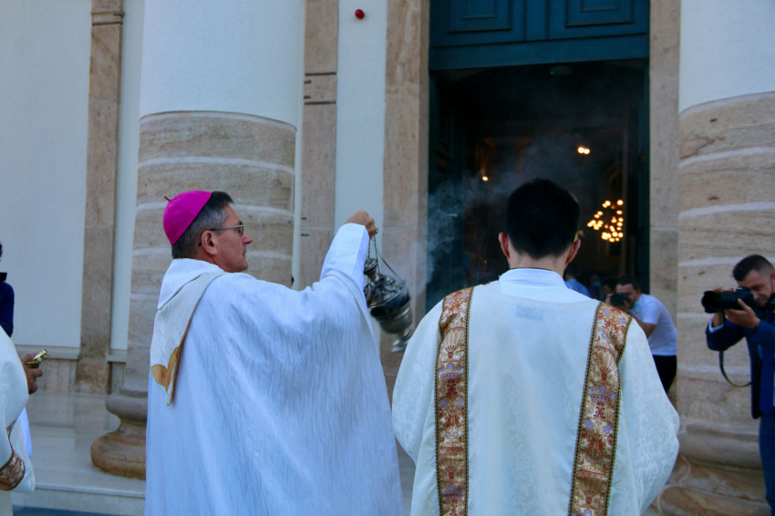Az ünnepi szentmise elején Schönberger Jenő a frissen megáldott szenteltvízzel megáldotta a felújított főtemplomot, ezáltal Isten oltalmába és a szent cselekmények szolgálatába ajánlotta. Ugyanakkor, ahogy szentbeszédében is emlékeztette a jelenlévőket: