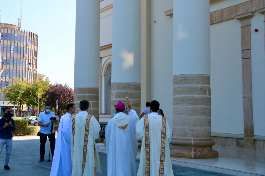 A szentmise előtt Schönberger Jenő püspök ünnepélyesen köszöntötte a jelen lévő egyházi méltóságokat, valamint a helyi és anyaországi politikusokat, majd Hankovszky Ferenc püspöki helynök és Koncz Andrea projektmenedzser ismertették Szatmárnémeti római katolikus székesegyháza felújításának fontosabb mérföldköveit.