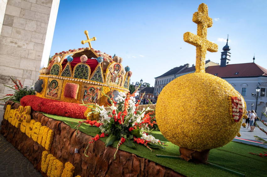 Emellett a Szent Koronát ábrázoló virágkocsit láthatjuk még a Mátyás-templomnál a NEK hetében; Szent István király intelmeinek bizonysága szerint a Szent Korona jelenti az országot, a királyságot, a királyt, a hitet, az egyházat, az uralkodói tulajdonságokat és az erényeket. Fiának, Imre hercegnek azt írja, hogy „az erények mértéke teszi teljessé a királyok koronáját”. A kompozíció a koronázási jelvényekkel – az országalmával és a jogarral – teljes.