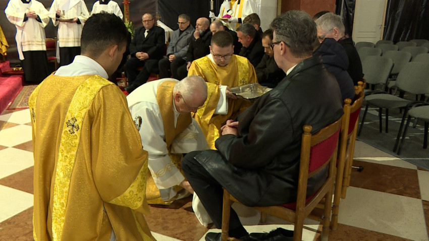 A homíliát követően a liturgiában felidézték és megjelenítették Jézus példáját, aki megmosta tizenkét tanítványának lábát.