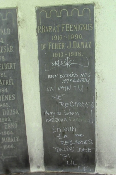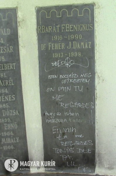 Pénteken telefonon tettem feljelentést a rendőrségen, és hétfőn a nyomozóval együtt mentünk ki a helyszínre. Addigra a sírkövet valaki letisztította, de az előzőleg készített fényképek alapján a rendőrség eljárást indított ismeretlen tettes ellen – mondta el Szalay György, a komáromi bencések jogi képviselője, akinek véleménye szerint az eset összefügghet a bencések elleni hangulatkeltéssel és a komáromi rendház ellen a nagyszombati érsekség részéről indított támadásokkal.