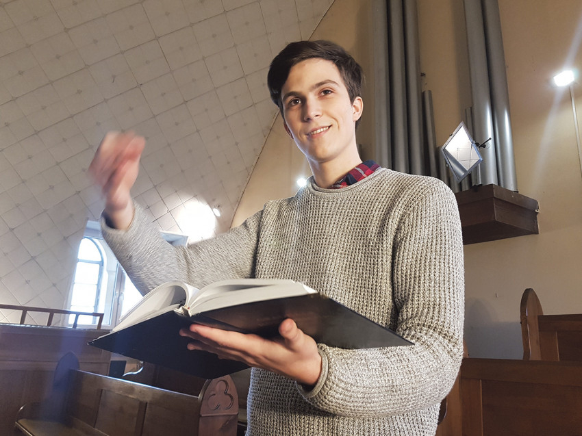 – Tulajdonképpen csak egyvalamivel, a zenével, de sok helyen és sokféleképpen. Egyetemre járok, a templomban ellátom a kántori szolgálatot, vezetem a templomi kórust, énekelek a Zeneakadémia kórusában, az Alma Materben, amelynek külön programjai vannak, rendszeresen énekelek a terézvárosi templom kórusában is, és alkalmanként a belvárosi Szent Mihály-templomban is, a régi rítusú szentmisén. Korábban a Deák téri evangélikus templom kórusába, a Lutherániába is jártam Kamp Salamon tanár úr miatt, meg azért, mert ott szinte kivétel nélkül csak Bach szerepel a műsoron. Bach a kedvenc zeneszerzőm. Tervezem is a visszatérést. Kamp tanár úr meghatározó személyiség az életemben, példaértékű számomra a zenéhez való hozzáállása.