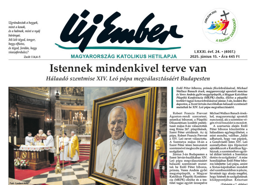 A címlapon kezdődik tudósításunk arról, hogy Erdő Péter bíboros, prímás főcelebrálásával, Michael Wallace Banach érsek, magyarországi apostoli nuncius és Veres András győri megyéspüspök, a Magyar Katolikus Püspöki Konferencia (MKPK) elnöke, illetve a püspöki testület tagjai koncelebrálásával június 3-án Budapesten, a Szent István-bazilikában hálaadó szentmisét mutattak be XIV. Leó pápa megválasztásáért.