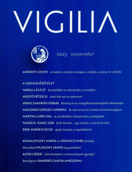 Andrew Louth A modern ortodox teológia: a múltja, a jelene és a jövője című tanulmánya után, A szemlélődő élet című tematikus összeállításban Varga László Szemlélődés és növekedés a csendben, az augusztusban elhunyt Mustó Péter SJ Amit hite ad az embernek, Hidas Zakariás OSBobl Thomas Keating és az evangélium kontemplatív dimenziója, Nacsinák Gergely András A belső rengeteg. Az ima arcai az ortodox kereszténységben és Martin Laird OSA A szemlélődés visszatérése a teológiába című írása olvasható. A témához kapcsolódik az Esszék rovatban Erik Varden OCSO Apáti tanítás a zúgolódásról című könyvrészlete, Tamás D. Ignác OSB fordításában és bevezetőjével.