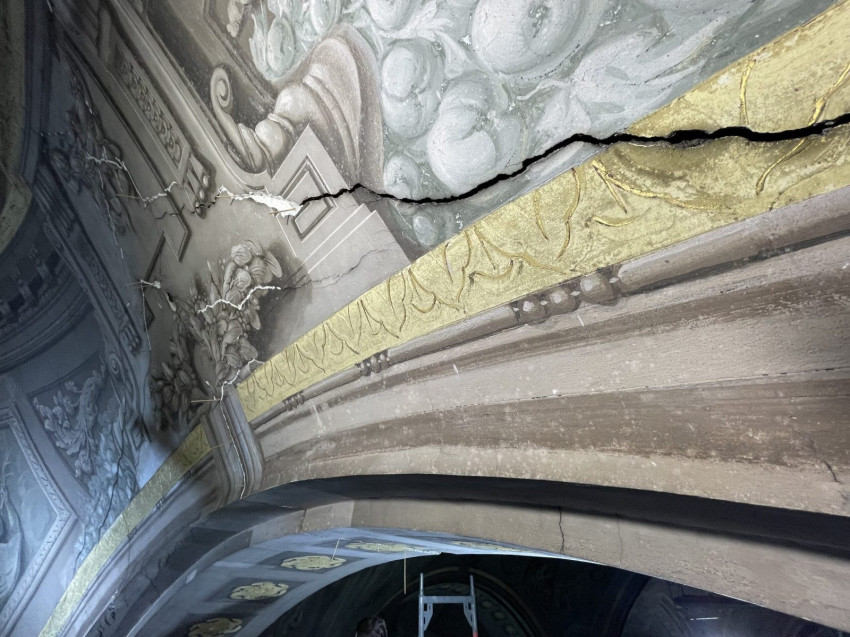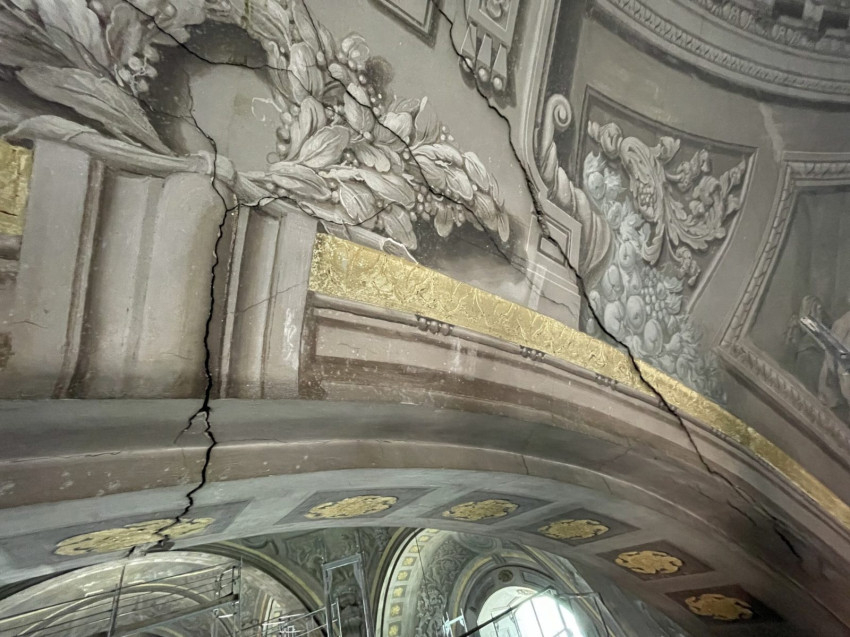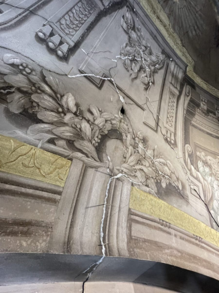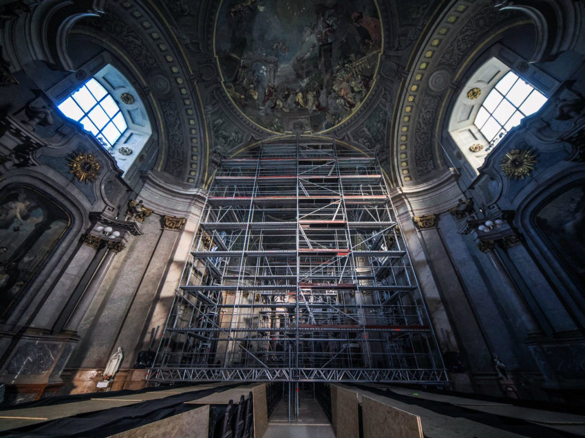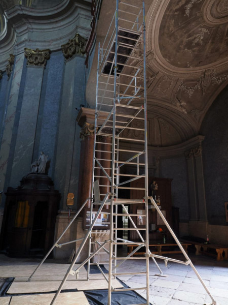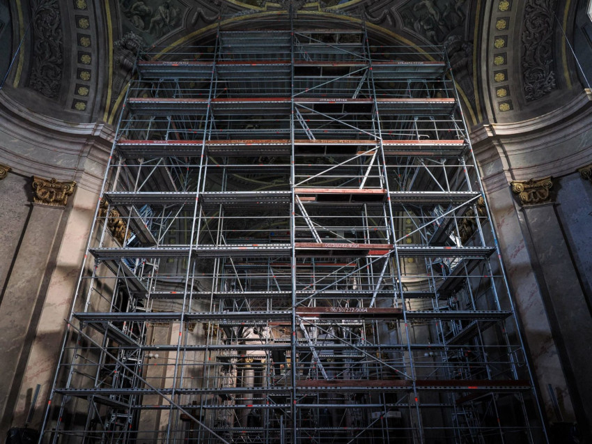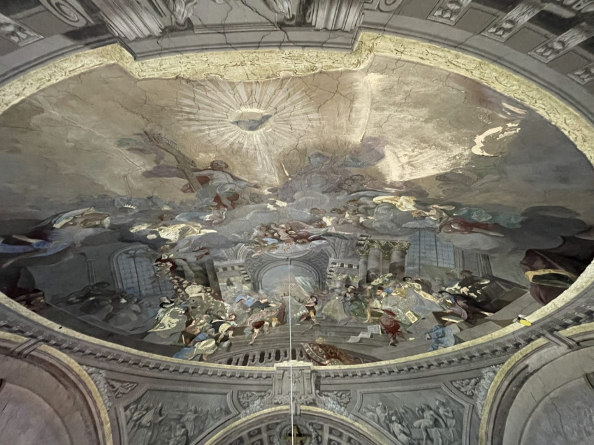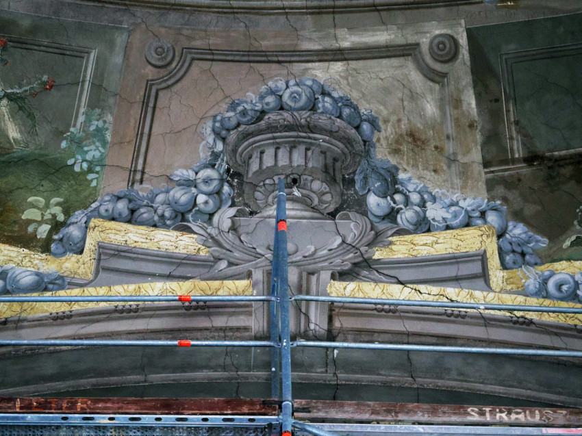 Akadnak olyan felületek, ahol injektálni, stabilizálni kell a falazat, a boltozat belső szerkezetét is, viszont sok helyütt ezeken a részeken kívül egy festett felület van. A templom falait Franz Anton Maulbertsch (1724–1796) freskói díszítik, amelyeket mostanáig érintetlen, eredeti állapotukban tekinthettünk meg – igaz az idő előrehaladtával romlásnak indultak. A mester és segédei szekkótechnikával dolgoztak, így ezeknek a rétegeknek a megtartása nem a legjobb. Most az elsődleges feladatunk a festékrétegek stabilizálása, valamint a repedések mellett meglazult festékrétegek rögzítése, a falazat injektáló habarccsal való visszaforgatása, hogy az értékes falfestmények ne sérüljenek tovább.