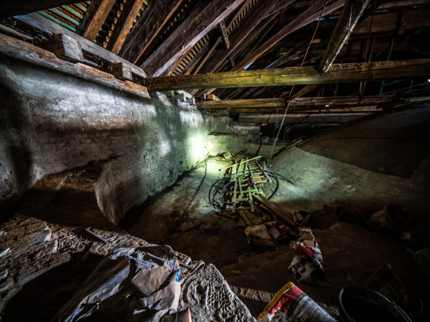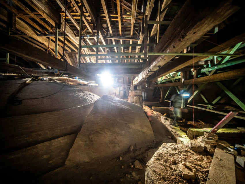Szerencsére a szakemberek nem léptek át azon a tényen, hogy kívül-belül határozott repedéseket látunk a falon, és statikai felülvizsgálatot végeztek. Kiderült, hogy a tetőszerkezet – amely közel 25 méter szélességet hidal át – szétnyomja a templom falait. A padláson látható, hogy a teljes hosszfal belső oldalán, a boltozatoktól három centiméterre elvált az oldalfal. Ennek eredményeként újabb repedések jelentek meg a boltívek közepén. Az állványokról közelről is meg tudtuk vizsgálni az adott falszakaszokat, és akadt olyan hely, ahol a habarcs már csak féloldalasan fogja a téglákat. Az csak idő kérdése, mikor pottyan onnan ki egy-egy tégla, amely így hiányozni fog a szerkezet erőjátékából. Abban a szerencsés helyzetben vagyunk, hogy még akkor tudjuk megerősíteni a templomot, amikor a laikusok számára szinte észrevehetetlenek ezek a repedések – összegzett a statikus.