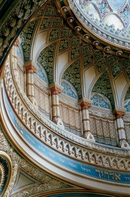 A négy márványoszlop feletti négy héber szó: a tóra, a tanulás és a jótékonyság gyakorlását jelenti, ami a zsidó vallás tanítása szerint az erkölcsi világot meghatározó tényezők. A kupoladob 24 oszlopa a nap 24 óráját, fölötte kék alapon a csipkebokor virágai a hitet jelképezik. A végtelen tér élménye fogalmazódik meg a kupola növényzetét jelző zöldes-barna díszítő sorától egyre sötétedő csillagos, kék üvegburkolatban. Középütt a csillagos ég a Dávid csillaggal, körülötte a nap kivilágítható sugarai koronázzák meg az égboltot. Az üvegkupola és valamennyi ólomüveg ablak Roth Miksa alkotása. A zsinagógában 1340 ülőhely van.