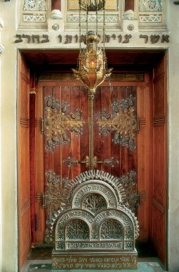 A zsinagóga frigyszekrénye, amely Nílusparti sittimfából készült, izsóp növényt ábrázoló pánt díszítéssel. A frigyszekrényben őrzik a tórákat, Mózes öt könyvét.