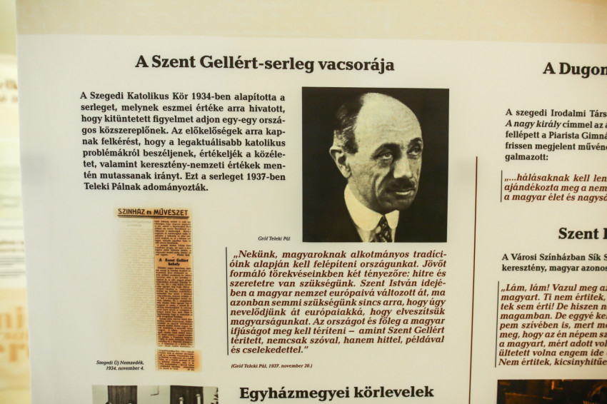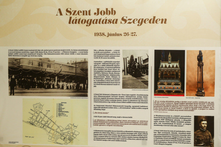 1938 annus mirabilis volt: a 34. Nemzetközi Eucharisztikus Kongresszus éve, valamint Szent István halála és országfelajánlása, vagyis a Regnum Marianum kilencszázadik évfordulója. A Szeged-Csanádi Egyházmegyében Glattfelder Gyula püspök, Apor Vilmos gyulai apát-plébános és Lindenberger János apostoli kormányzó mindent megtettek azért, hogy Szeged városában és a püspökség területén, valamint a csonka Váradi Egyházmegye területén élő hívek felemelt szívvel készüljenek és ünnepeljenek. Ennek a készületnek és ünnepnek állít emléket a Szegeden újonnan nyílt kiállítás.