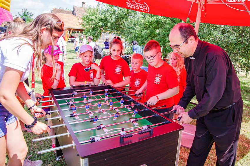 A szentmisét követően következhetett a játékok kipróbálása. A püspök is beállt a gyerekek közé, néhányukkal izgalmas csocsómérkőzéseket játszott.