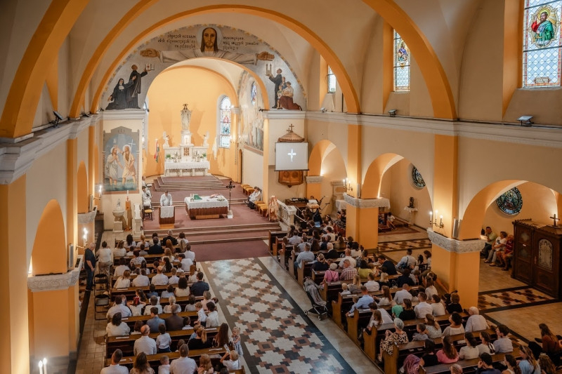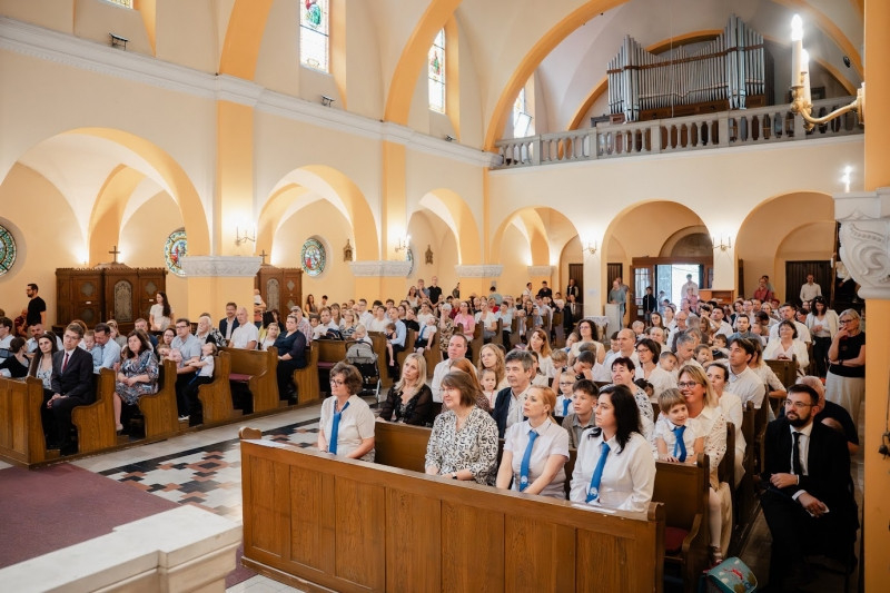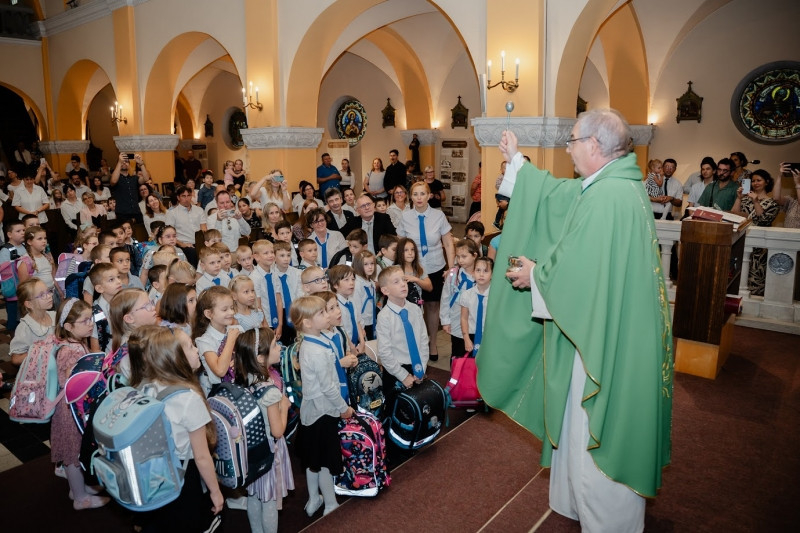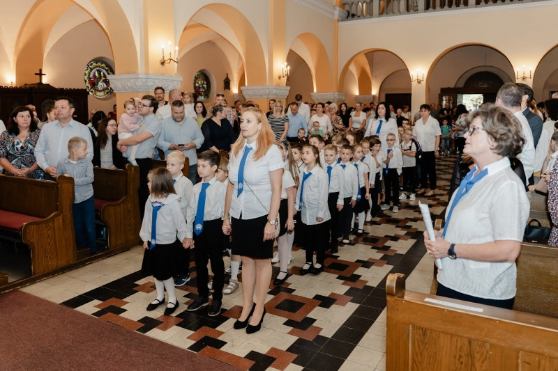 A kisdiákok ünnepélyes keretek között vonultak be a templomba osztálytanítóik vezetésével.