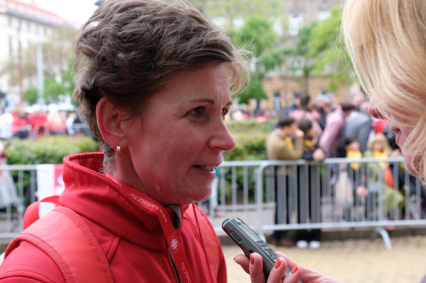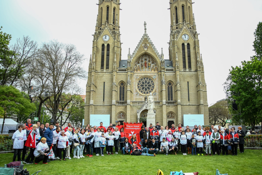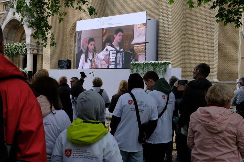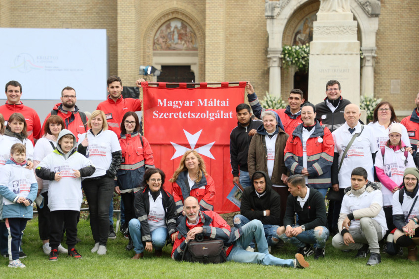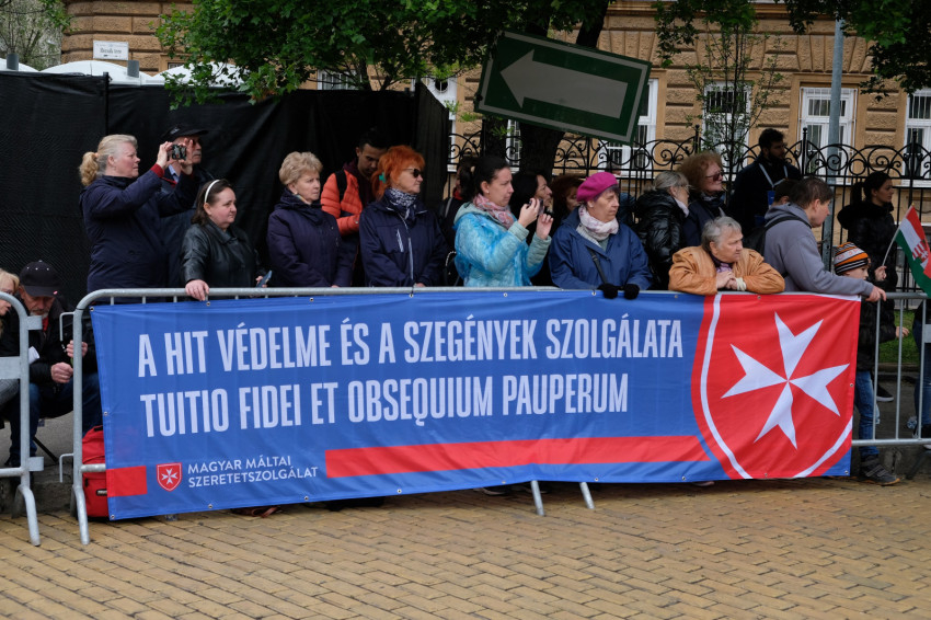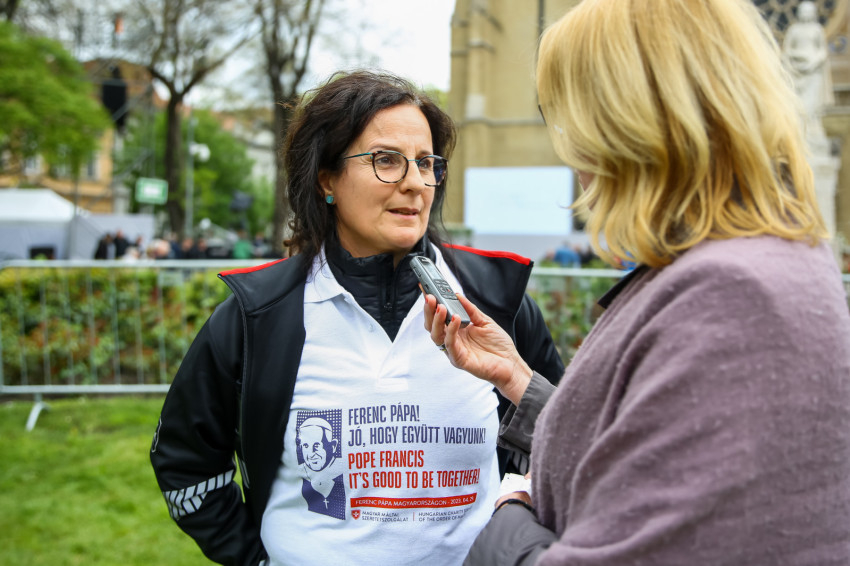 A Magyar Máltai Szeretetszolgálat munkatársai összeálltak egy közös képre a zászlójukkal az Árpád-házi Szent Erzsébet-templom előtt. Utána elsőként Morva Emíliát, a segélyszervezet közép-magyarországi régiójának vezetőjét kérdeztem, hogyan élte meg a találkozást Ferenc pápával.