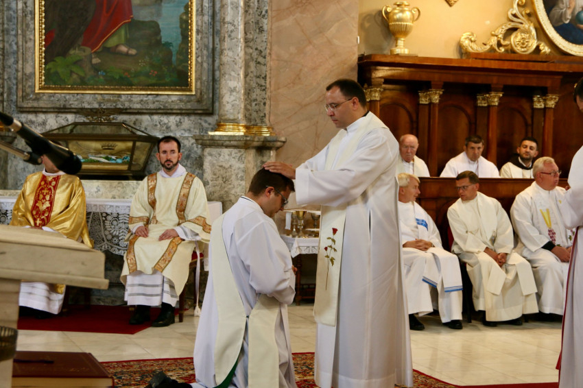 Ezután a főpásztor áldozópappá szentelte Daly Attilát, majd krizmával megkente a kezét, emlékeztetve az Írás szavára: „Az Úr kent föl engem. Elküldött, hogy örömhírt vigyek a szegényeknek, és meggyógyítsam a megtört szívűeket.” (vö. Iz 61,1)