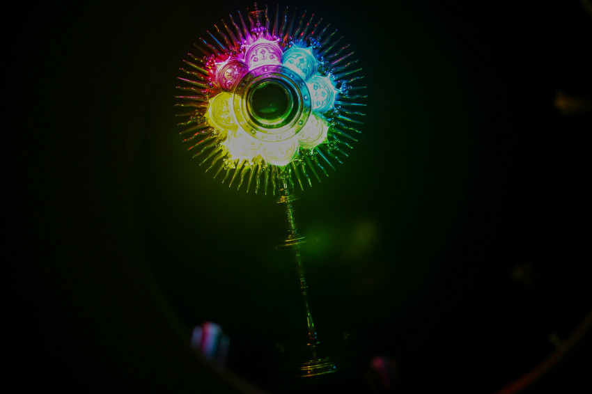 Ha a lyukon keresztül próbáljuk megnézni, nem láthatjuk: elvakít bennünket a szembefény. A falra színes, egymással keveredő foltok vetülnek csupán, de néhol, ahol valamennyi szín megfelelő módon együtt áll, megszületik a tiszta, fehér fény, amely minden színt tartalmaz, magában hordozva a teljességet: a megújult kiáradást. Hasonló ez ahhoz, mint amikor Istenre gondolunk; az ő fényének is csak földi kivetülését érzékelhetjük – magyarázta Mátrai Erik.