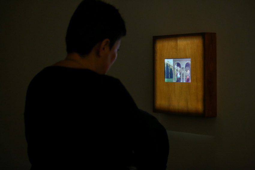 Mátrai Erik neve nem ismeretlen a Pannonhalmi Főapátság kiállítótereiben: két korábbi művével szerepelt már a 2009-es Az ikontól az installációig című kiállításon. Abban az évben egy szerzetessel folytatott beszélgetés során merült fel benne a kérdés: lehetséges-e a 21. században igazi ikont készíteni? Mátrai arra a következtetésre jutott, hogy nem lehet, és e belátás fordulópontot eredményezett alkotói megközelítéseiben. Isten jelenlétének megragadása, a hit továbbra is központi kérdése maradt, de kifejezésformáiban absztraktabb megoldások felé mozdult. Ennek egyik megnyilvánulása a mostani tárlaton látható fényinstalláció, amellyel kapcsolatban elmondta: a katolikus liturgia egyik fontos eleme a monstrancia, melyben kiemelt alkalmakkor felmutatják a Szent Ostyát, Krisztus testét. Fényes, sugaras kialakítása a Szentlélek kiáradását jeleníti meg nagyon egyszerűen, szinte piktogramszerűen. A kiállított munkában azonban nem maga a monstrancia van kiemelve, sőt: valójában el van rejtve egy kubusban, amelyen belül erős megvilágítást kap. Ez a fény egy résen keresztül kiárad, és a szemközti falra vetül. Nem magát a tárgyat látjuk tehát, hanem az általa visszavert fényt: így mintegy fénytestet öltve jelenik meg a térben.