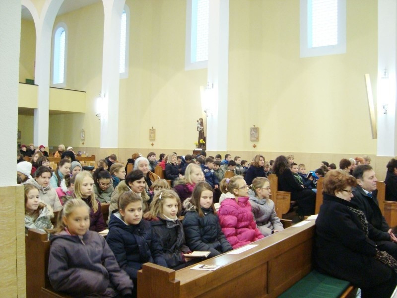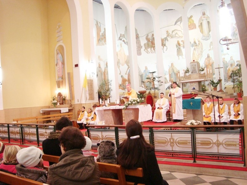 Az ünnepségsorozat püspöki szentmisével kezdődött a komáromi Jézus Szíve-plébániatemplom. Pápai Lajos főpásztor az adventi időszakra való emlékeztetéssel kezdte szentbeszédét. Ezután a napi evangéliumhoz illeszkedően a végidőkről és a keresztény ember reménységéről beszélt. Kifejtette, a végső választás minden ember számára aközött lesz, hogy „Krisztussal” vagy „Krisztus ellen”. Hangsúlyozta, a mennyek országa nem valamiféle távoli, bizonytalan hely, hanem mindannyiunkat váró bizonyosság. Gonzága Szent Alajos történetét felidézve hozzátette, ha életünk minden napját Krisztus jelenlétében töltjük, nem érhet minket meglepetés. Példákon keresztül fejtette ki, sokan vannak jóravaló emberek, akik nem ismerik hitünket. „Az ő számukra ti legyetek azok, akik elviszik Krisztus örömét!” – szólt az iskolásokhoz. Ezután a katolikus iskolák fontosságát emelte ki, hangsúlyozva a kapott talentumok megsokszorozásának fontosságát. Végezetül arra kérte a diákokat, vigyázzanak a megújult iskolára, és figyeljenek tanáraik, lelkipásztoraik szavára, hiszen a Szent Imre-iskola karácsonyi ajándéka már megérkezett számukra.
