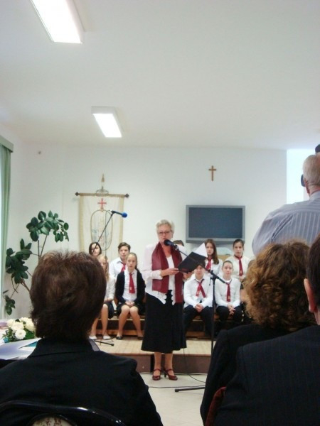 Az ünnep folytatására az iskola ebédlőjében került sor, ahol az iskola tanulói rövid verses-zenés műsort adtak, majd Peredi Ágota igazgató szólt az egybegyűltekhez. Kifejezte örömét, hogy ilyen sokan fontosnak tartották az iskola megújulását, és köszönetet mondott mindenkinek, aki a pályázatot segítette.
