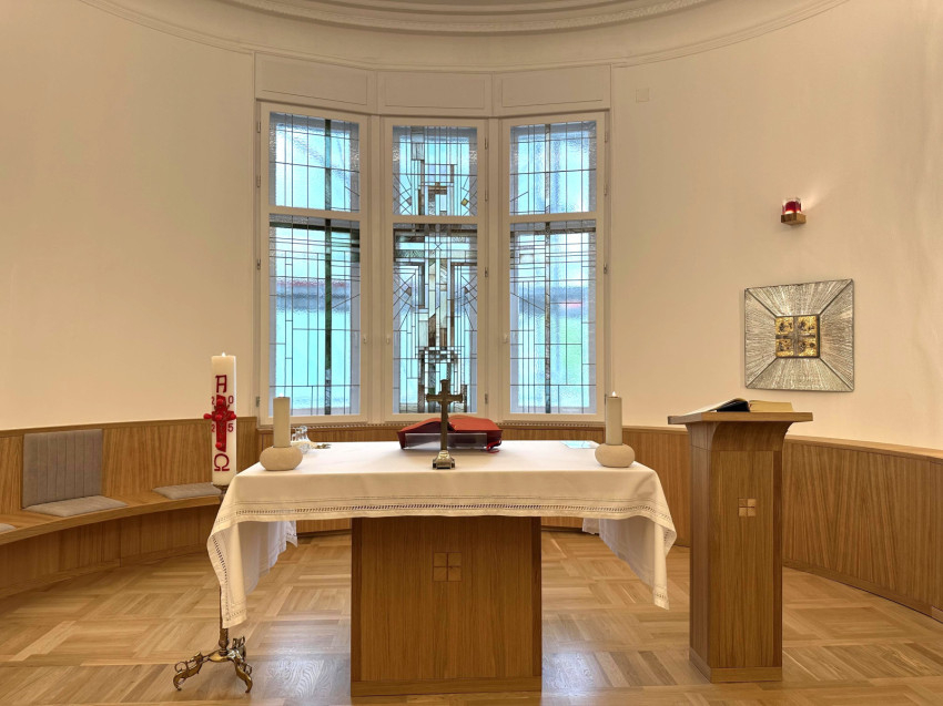 A három kereszt a Golgotára utal és arra is, hogy Krisztussal mi, emberek szoros közösségben vagyunk. Ennek a közelségnek a napról napra egyre bensőségesebb megélésére hívja meg a körülbelül negyven férőhelyes kápolna a Titkárság munkatársait.