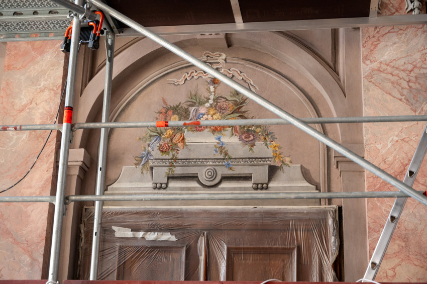 2023 októbere óta dolgoztak a szakemberek azon, hogy visszanyerje régi szépségét a püspöki palota dísztermének ezen oldala.