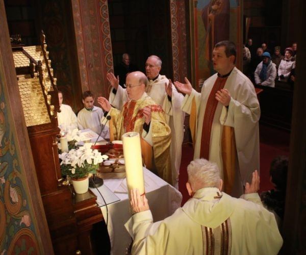 A szentmise kezdetén a főpásztor megáldotta a belsejében teljesen megújult templomot, az új szószéket, valamint az 1917. február 14-én itt nyugalomra helyezett báró Hornig Károly bíboros-püspöknek a felújítás során elkészült síremlékét. A munkálatok során a templom szentélyéből – a hely szűkössége miatt – kikerült a szembemiséző oltár.