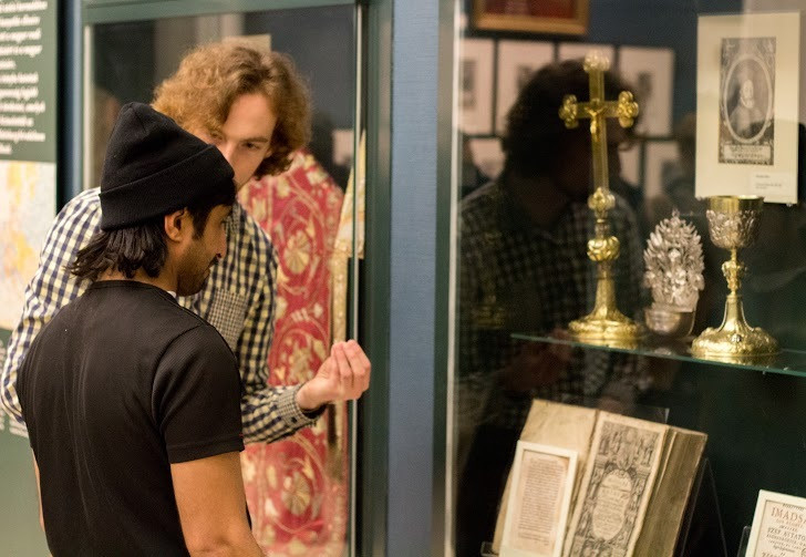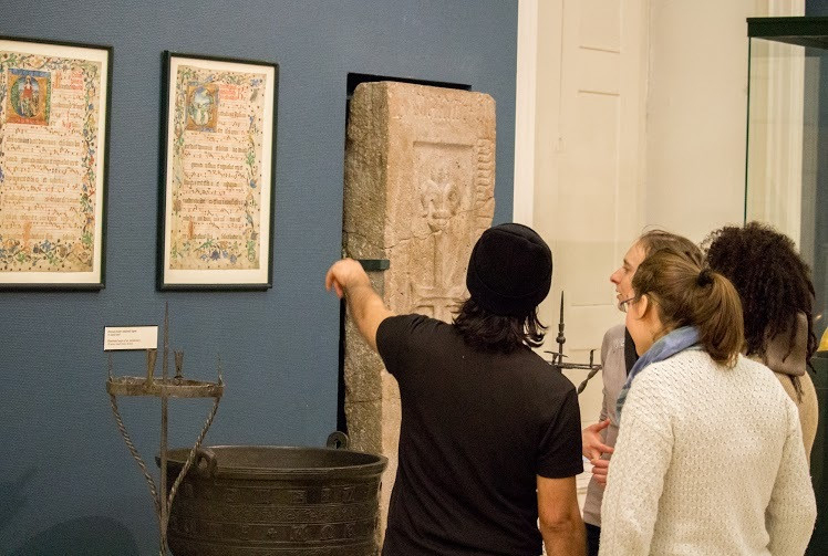 A Szíriából és Irakból érkezett menekültek egy kisebb csoportja különösen nagy érdeklődéssel követte a tárlatvezetést, az arab feliratoknál elmélyülten próbálták megfejteni a korabeli szövegek jelentését.