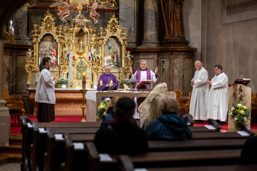 Homíliájának végén Holczinger Ferenc SJ így fohászkodott: „Meghalt és feltámadt Jézus Krisztus, töltsd el szívünket bátorsággal, hogy merjünk veled időt tölteni, Téged követni; hogy megismerjünk, szeressünk, Benned felismerjük az igazságot és az életet – az örök életet. Adj erőt, hogy bizalommal és áldozatkészen válaszoljunk hívásodra, hogy zűrzavaros korunkban Egyházadban egymást nagylelkűen támogatva, Veled közösségben megtapasztaljuk a boldogságok útjának áldását. Add, hogy ezen az úton járva fokról fokra szomorúságunk forduljon át vigasztalásba. Örök világosságod fényeskedjen a magadhoz szólított tanáraink és diákjaink arcán.” Ámen.