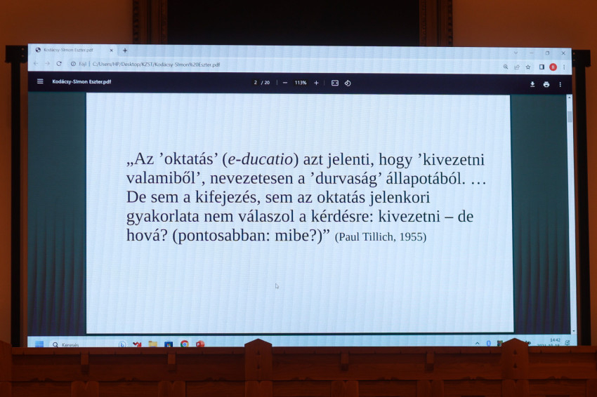 Kodácsy-Simon Eszter, az Evangélikus Hittudományi Egyetemi docense Paul Tillich, a 20. század egyik lejelentősebb evangélikus teológusa nyomán az oktatás három jellegét különböztette meg: A technikai oktatás készségek, képességek fejlesztését, az egyes mesterségekre való tanítást jelenti. A humanista jelleg az emberben rejlő mindenféle egyéni és társas lehetőségek kibontakoztatásának fejlesztését célozza. A beavató oktatás pedig a „lét titkába”, az életkérdésekre adott vallási szimbólumok világába kíván bevezetni. Ez utóbbi az a terület, ahol az egyházi iskolának meghatározó szerepe lehet. Az előadó hangsúlyozta, a beavatás mikéntjére kell rákérdeznünk: Milyen beavatást kínál az egyházi iskola, meg tudja-e szólítani a diákokat? Képes-e megmutatni, hogy az ember létkérdéseire adott válasz a vallási szimbólumokban található? Kodácsy-Simon Eszter szerint az egyházi iskola akkor tud kapaszkodót nyújtó választ adni a létkérdésekre, ha a vallási szimbólumok „túlmutatnak mind a felekezeti, mind a nemzeti, mind más határokon”.