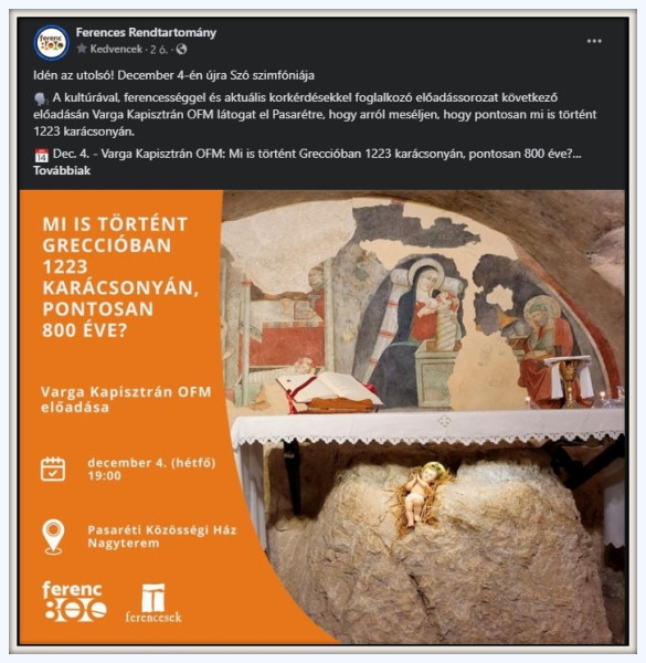A Ferences Család számára kiemelt ünnep, amikor Greccióra emlékezünk – mondta a sorozat szervezője és házigazdája, Bagyinszki Ágoston OFM –, miközben a saját karácsonyunkra is készülünk valamennyien advent idején.