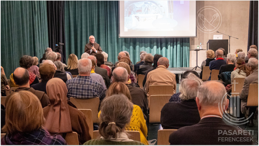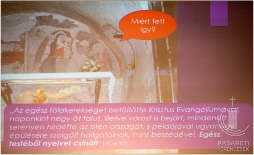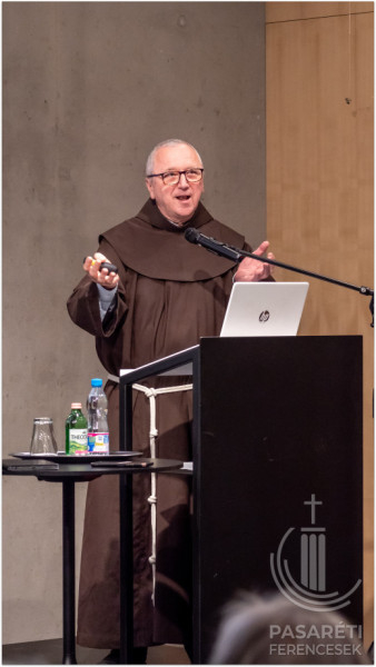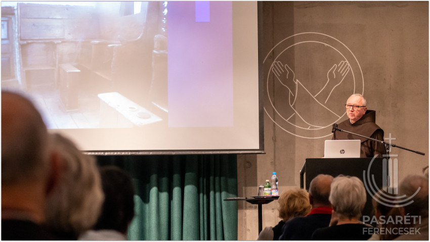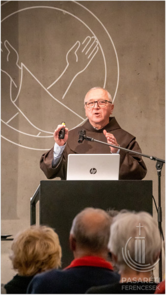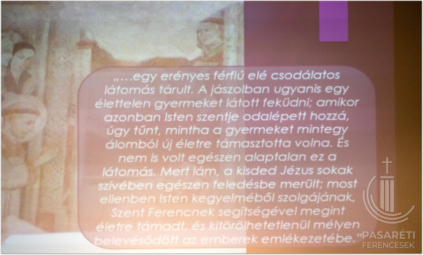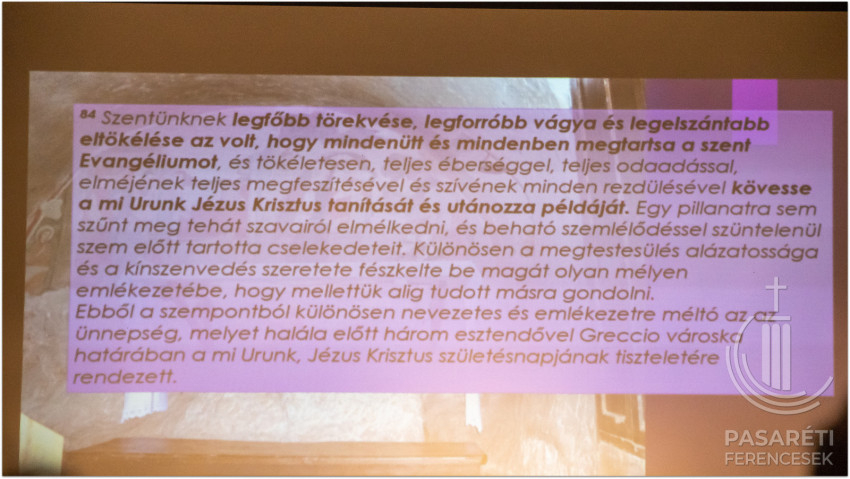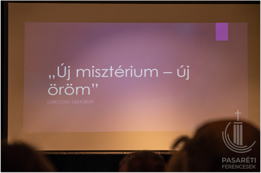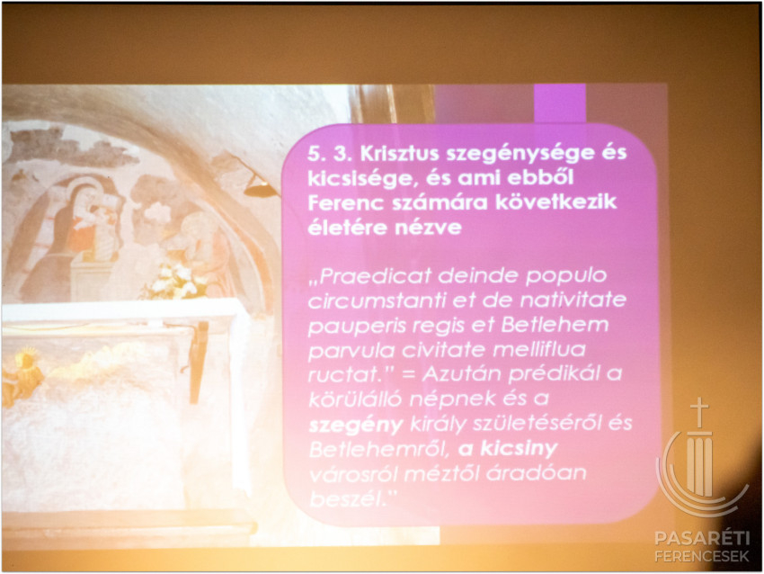 Emellett az örömről és vigasztalásról szól. Greccióból szinte új Betlehem lett. Lukács evangéliuma kapcsán Kapisztrán atya utalt azokra a mesékre, melyekben egymáshoz ragadnak a szereplők – ehhez hasonlónak látja az evangéliumi történetet, attól kezdve, hogy az angyal Máriának azt mondja: Örülj! – és sorban átragad az emberekre az öröm; mindenkire, aki kapcsolatba kerül a megtestesülés misztériumával. Hogy fejezte ki az érzéseit Szent Ferenc? Például „a Betlehem szót bégető bárányka módjára ejtette ki”. Az előadó segítségül hívott egy 18. századi ferences zeneszerzőt és sztárprédikátort, aki Szécsényben is volt orgonista: Edmund Pascha karácsonyi miséjéből mutatott egy bégetős Benedictust a hallgatóságnak. A Celanóinál említett lovag látomása: egy látomás – figyelmeztetett a ferences előadó. – Valójában nem volt ott senki és semmi. Mégis „belevésődött az emberek emlékezetébe” – olyannyira, hogy ennek a 800. évfordulóját ünnepeljük – állapította meg Kapisztrán atya.