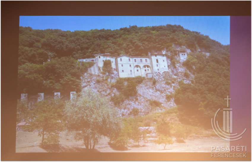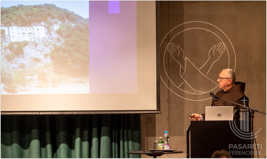 Varga Kapisztrán Celanói Tamásra épülő előadásában gazdag képanyaggal mutatta be a közönségnek a „fecskefészekszerű” kis remeteséget, a barlangot, a grecciói karácsony helyszínét. Saját élményei alapján, érzékletesen festette le a Rieti-völgyet, a kápolnákat, kolostorokat, a városkát („falu nincs, minden città Olaszországban”). A freskókkal díszített barlang, a Bonaventura-féle dormitórium – utóbbi kapcsán elmagyarázta, a remeteségekben nem pusztán függönnyel választották el a hálóhelyeket, mert lehetővé akarták tenni, hogy bárki, bármikor és bárhogy kíván imádkozni, arra módja legyen. Bemutatta a Greccióban látható, egyik legfontosabb korai Szent Ferenc-ábrázolást. Itt az év minden napján lehet karácsonyi misét mondani – osztotta meg a hallgatósággal.
