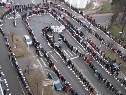 Hónapról hónapra egyre nagyobb tömeget vonz az elsőszombati ünnepélyes Mária-köszöntő és gyertyás körmenet a csíksomlyói kegytemplomba. Az év első alkalmán, január 4-én este is több ezren gyűltek össze, hogy a Szűzanya közbenjárását kérjék imáik meghallgatásához. A januári estén betegek imádkozták a rózsafüzért betegekért.