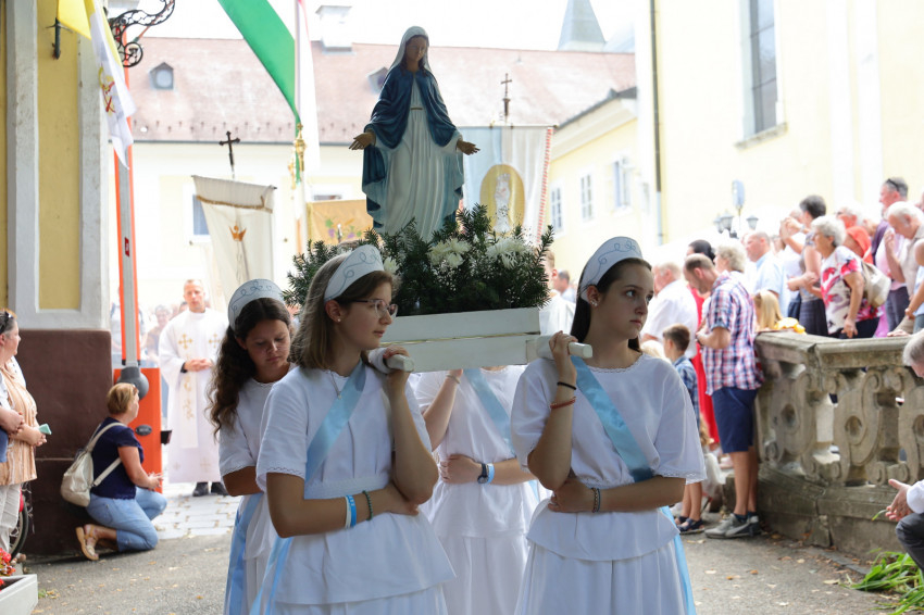 A szentmise végén körmenetben hordozzuk Mária szobrát.