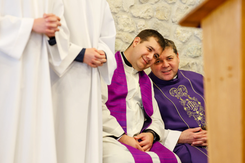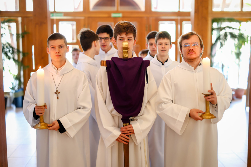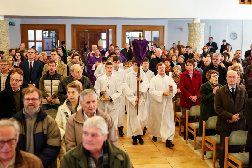 Gitáros kórus énekére vonult be Michael Wallace Banach érsek, Magyarország apostoli nunciusa; Tóth Tamás, a Magyar Katolikus Püspöki Konferencia titkára, a Szentcsalád Plébánia kisegítő lelkésze; Hatházi Róbert plébános; Ivanics Zoltán lelkipásztor, Lápossy Péter, a nuncius titkára; az állandó diakónusok és a ministránsok.