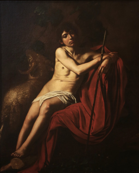 Caravaggio Keresztelő Szent János című festménye a szentet fiatal korában ábrázolja. A fiatal János gondolataiba mélyülve a semmibe réved. A művész talán azt a pillanatot ragadta meg, amikor a fiatal meghozza életre szóló döntését, és a pusztába vonul, elhagyva mindenét. Ennek jelképeként veti le ruháját, és veszi majd fel a teveszőrből készült ruhát. A vörös szín az életet és szeretetet jelképezi ezen a festményen, ami kiemeli a főalakot.