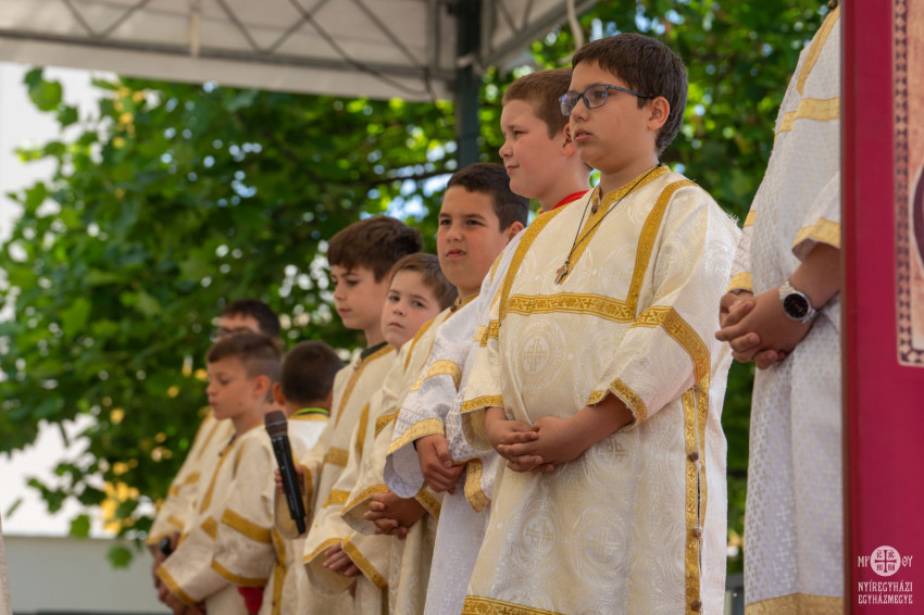 A délelőtti ráhangolódást követte a mennybemenetel ünnepkörében tartott Szent Liturgia, melyet Szocska Ábel nyíregyházi megyéspüspök jelenlétében celebrált Szabó Tamás pasztorális helynök, koncelebrált további tizennégy paptestvér, őket pedig húsz ministráns segítette a külső tábori oltár körül. A gyermekek hangsúlyos szerepe továbbá abban is megnyilvánult, hogy a kántori szolgálatba Gorcsa György főkántor mellett a Móricz-iskola diákjai kisebb kórusként kapcsolódtak be.