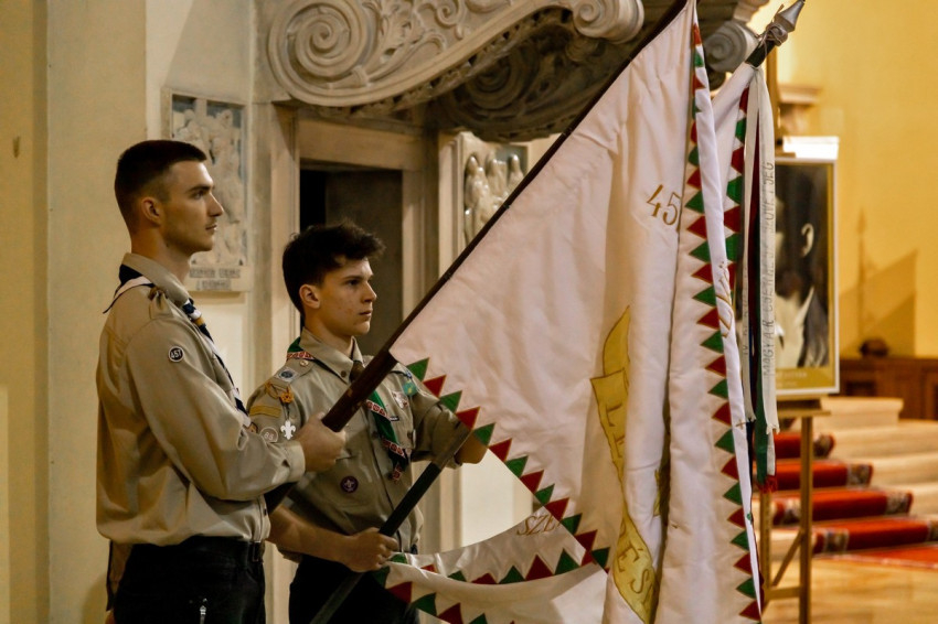 Az ünnepélyes zászlófelvonáson Brückner Ákos Előd ciszterci szerzetes, a magyarországi cserkészet egyik újraalapítója mondott imát.