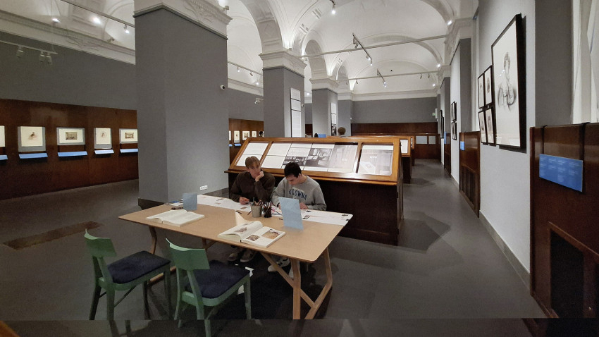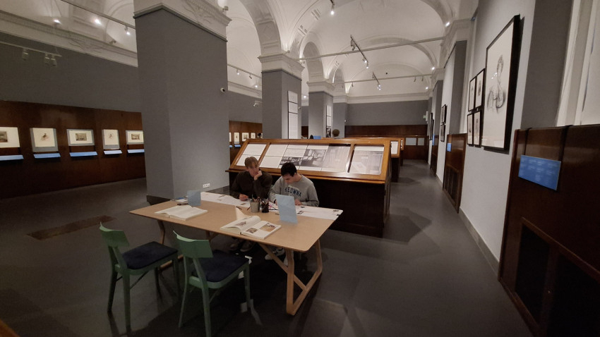 A kiállításon remek illusztrációk, rajzok, metszetek, a legújabb korból pedig fényképek világítják meg a Grafikai Gyűjtemény történetét a kezdetektől napjainkig. Az egyik 1578-ban készített lapon Cornelis Cort rézmetszete a képzőművészetek gyakorlatát mutatja be. A nyomaton mesterek és tanoncok tanulmányozzák az anatómiát, rajzvázlatokat készítenek az emberi csontvázról. Az egyikük éppen körzővel szerkeszt valamit. Néhányan jegyzeteket írnak a látottakról, vagy a tollukat hegyezik, s a háttérben ágaskodó lovat mintázó alakot is látunk. A művészeti tevékenységek sokféleségét figyelhetjük meg ezen a bravúros 16. századi metszeten.