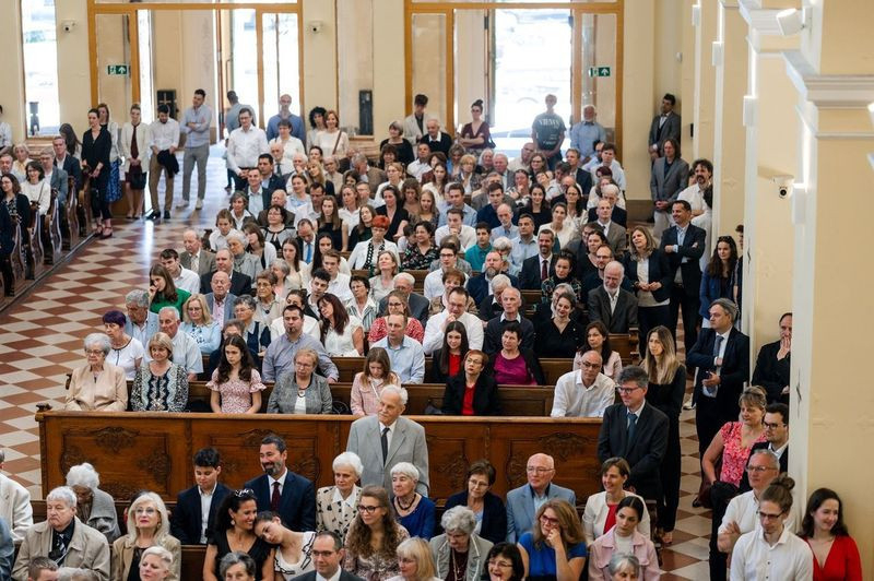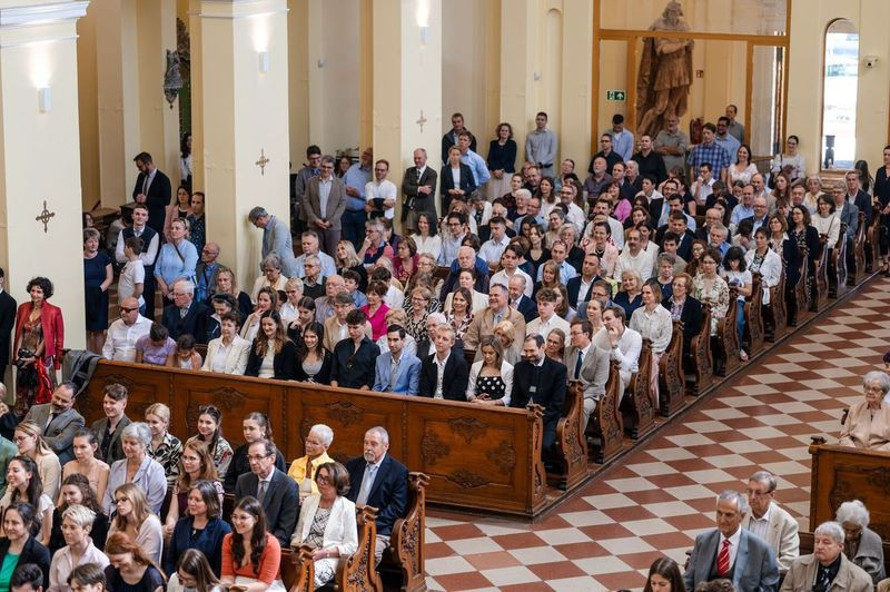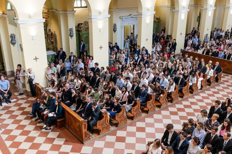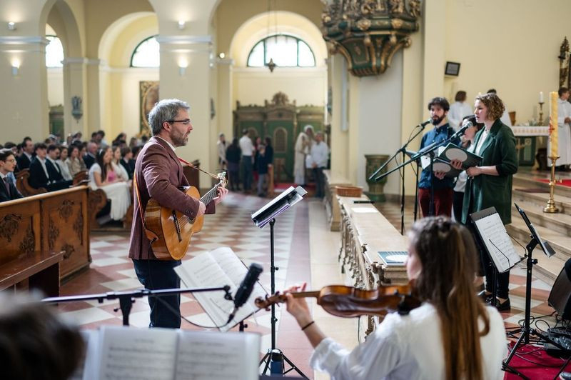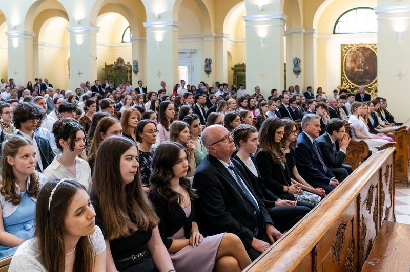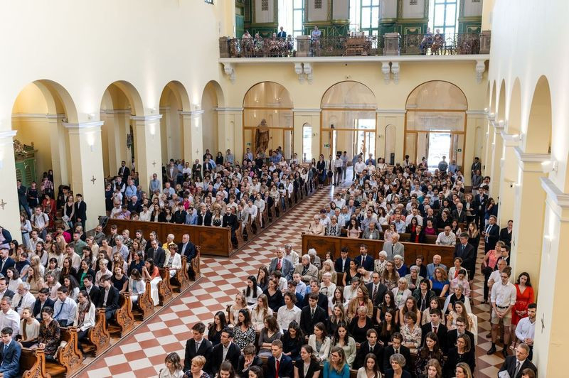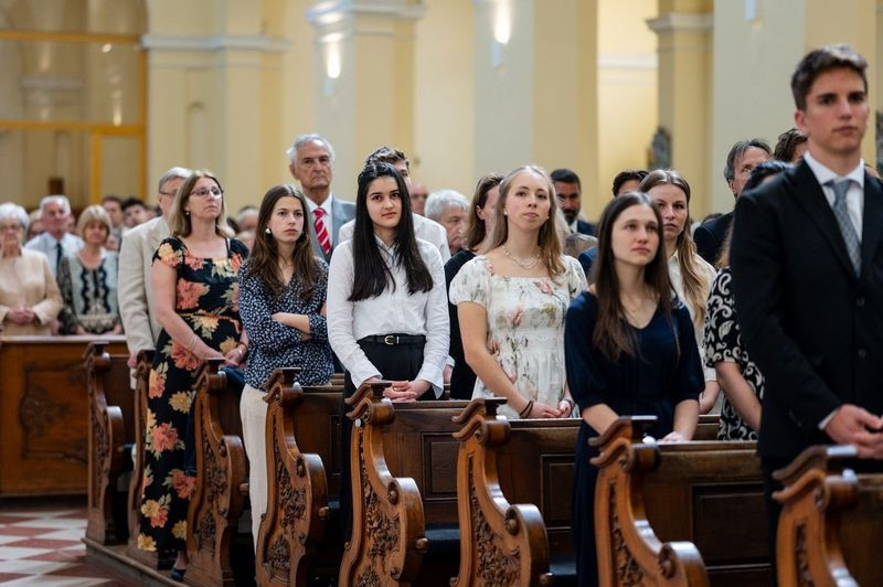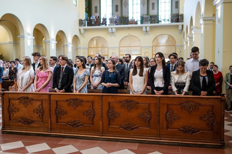 Május első szombatjának délutánján a Szent Imre-templomban a jelenlévők – bérmálkozók, bérmaszülők, családtagok, barátok – már a szertartás megkezdése előtt elmerülhettek a lelkesítő Szentlélek-hívó és -dicsőítő énekekben, melyeket a szentmisén zenei szolgálatot teljesítő Schönstatt közösség tagjai adtak elő Csermák Péter vezetésével.