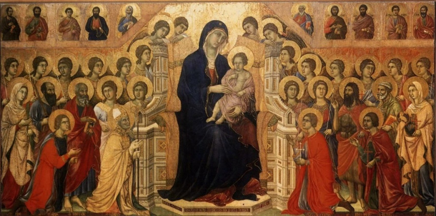 Duccio di Buoninsegna: Trónoló Madonna angyalokkal és szentekkel