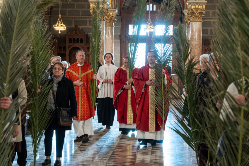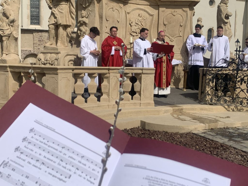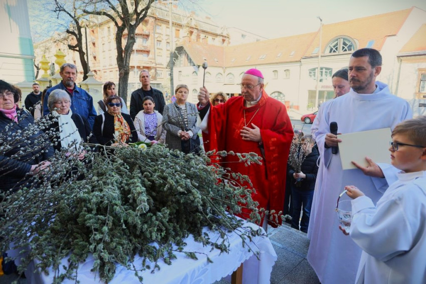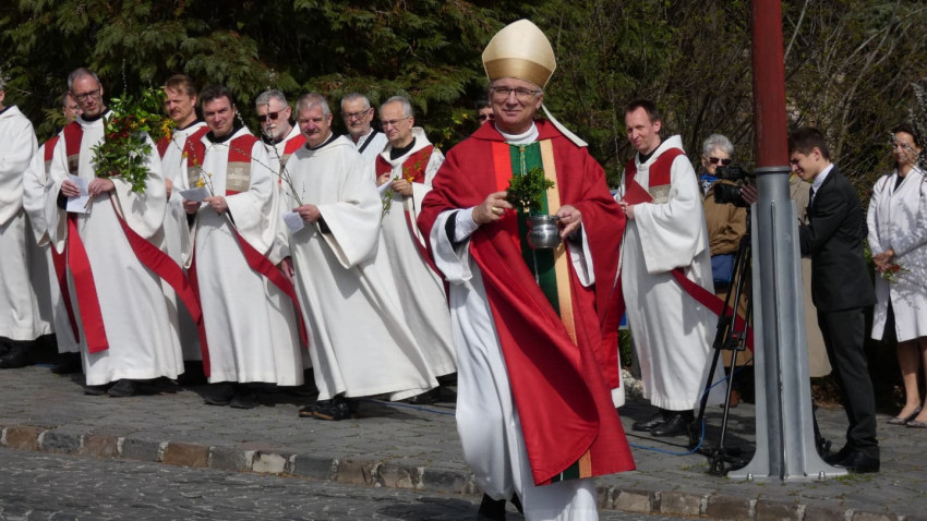 Barkaszenteléssel kezdődött a virágvasárnapi szentmise Veszprémben, a Szentháromság-téren. Ezután a Szent Mihály-főszékesegyházban elhangzott a passió, amelyet az idei évben a Padányi Katolikus Iskola kórusa énekelt.