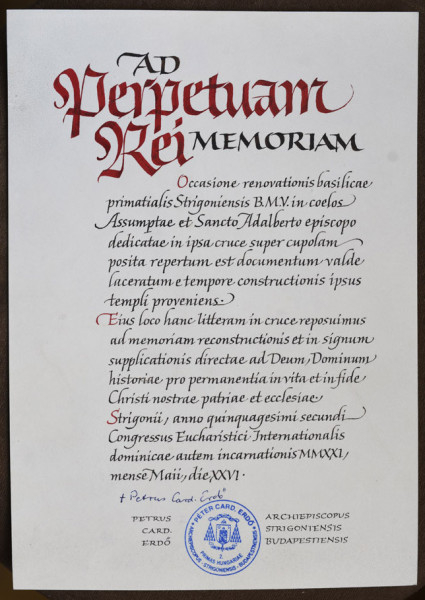 Az esztergomi, a mennyekbe fölvett Boldogságos Szűz Mária és Szent Adalbert püspök tiszteletére szentelt prímási bazilika felújításának alkalmából előkerült a kupola fölötti keresztbe helyezett, a templom építésének korából származó, súlyosan sérült irat.