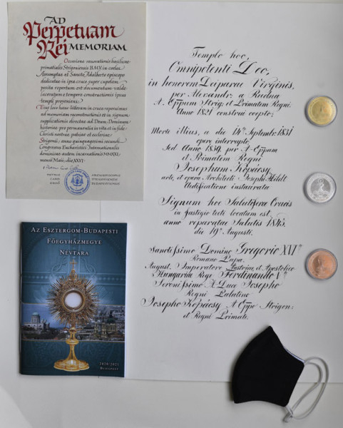 A főszékesegyház építésekor, 1845. augusztus 19-én Kopácsy József hercegprímás, érsek kezdeményezésére dupla falú réz hengerbe foglalt üveg kapszulában emlékiratot helyeztek el a kupola keresztjében. Mellé tették az Esztergomi Főegyházmegye adott évi névtárát (sematizmus).