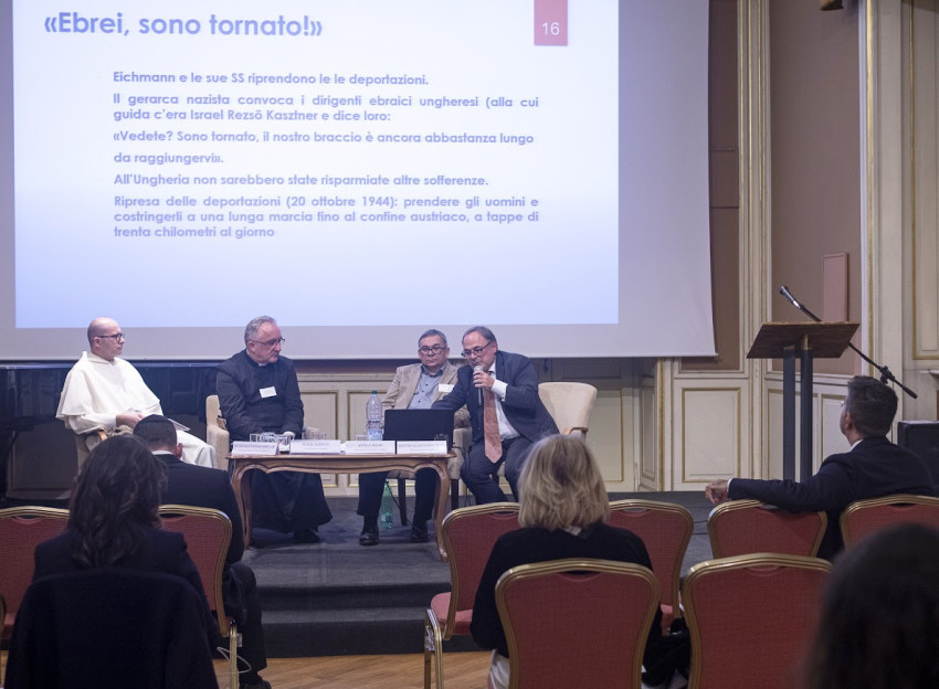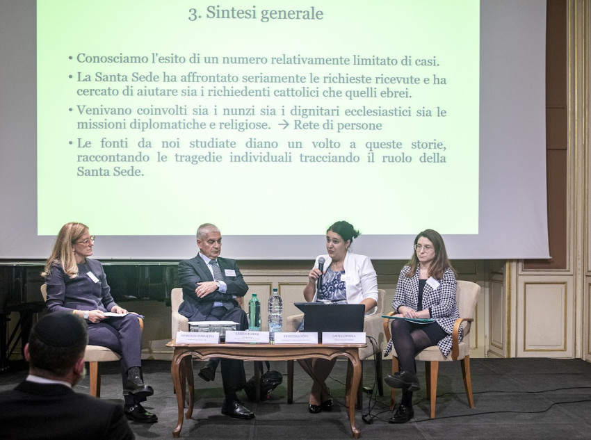 Matteo Luigi Napolitano, a Molisei Egyetem professzorának átvezető előadása nyitotta meg a sort, aki Angelo Rotta budapesti apostoli nuncius és a nunciatúra első titkára, Gennaro Verolino embermentő tevékenységéről beszélt. Őt Jakab Attila, a Holokauszt Emlékközpont kutatója követte, aki a Vatikáni Apostoli Levéltárban végzett kutatásai eredményét összegezte, szintén egy pápai követ, Andrea Cassulo bukaresti apostoli nuncius embermentő tevékenységén keresztül, aki mindent megtett az üldözött zsidók érdekében a román hatóságoknál. Kiváló kapcsolatot ápolt Alexandru Şafran főrabbival, és neki volt köszönhető, hogy 1943-ban nem deportálták a romániai zsidókat Transznisztriába.