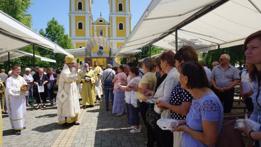 Orosz Atanáz püspök a liturgia záróáldása után meghintette a híveket szenteltvízzel, és megáldotta a kegytárgyakat.