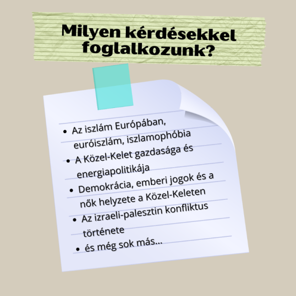 – Kedvcsinálóul néhány cím a képzési hálónkból, a teljesség igénye nélkül: Az iszlám Európában, euróiszlám, iszlamofóbia; Biztonságpolitika, kiberbiztonság a Közel-Keleten; Demokrácia, emberi jogok és a nők helyzete a Közel-Keleten; Éghajlatváltozás, demográfiai robbanás és migráció a Közel-Keleten; Az izraeli-palesztin konfliktus története. És még sorolhatnám…