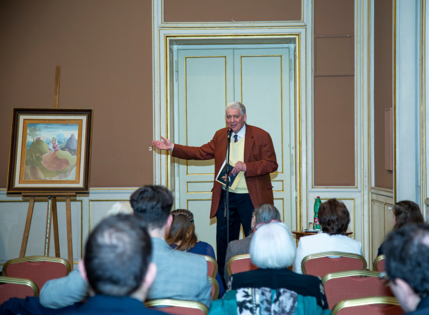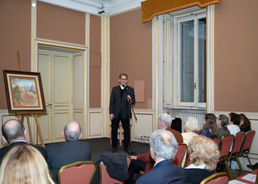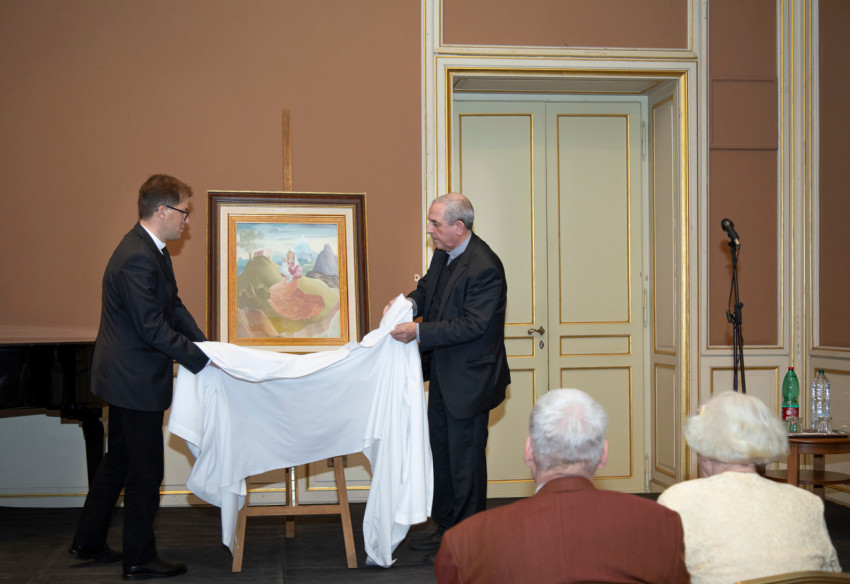 Németh Norbert atya, a Pápai Magyar Intézet rektora köszöntötte az estre megjelent magyar és olasz vendégeket. Örömének adott hangot, hogy a festmény a PMI-be került és nem rejtette véka alá, hogy a kép, annak egészében és a részletekben rejlő szépsége mennyire megérintette. Méltatta a 130 éve született festőművész alakját, életművét. Párhuzamot talált a hét dombra épült Róma városa és a dombon ülő Madonna között.