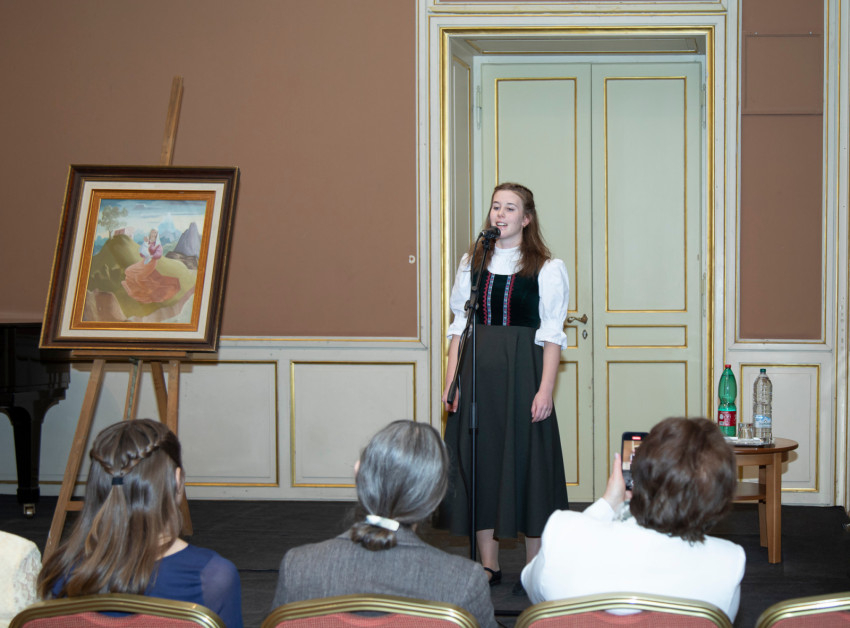 Göncz Mária a Szűzanyát köszöntő, dicsérő, veretes magyar népdalokkal, a kép és a szó mellett a zene hangjaival gazdagította az eseményt.