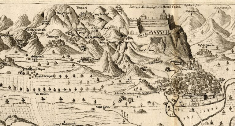 Montecassino egy metszeten, amelyet 1749-ben Szent Benedek apátságából