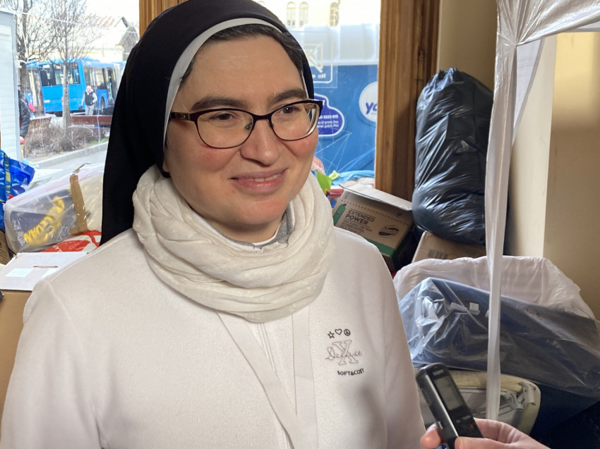 A derűs, mosolygós Petres Erika Lúcia domonkos nővér rendtársaival együtt reggel óta van itt, hamarosan érkeznek az újabb önkéntesek, akik felváltják őket. Kérdésünkre elmondja: mivel ma nem volt tanítás a Sapientia Szerzetesi Hittudományi Főiskolán, magától értetődő és természetes volt számukra, hogy kijönnek segíteni. Ma csak nagyon kevés magyar menekült érkezett, többnyire ukránok jöttek, akikkel nem nagyon tudtak kommunikálni, de voltak közöttük olyanok, akik a telefonjukon megmutatták a szétbombázott otthonukat. „Folytak a könnyeink, sírtunk egymás mellett.” A menekültek rendkívül hálásak azért, amit kapnak, az élelemtől kezdve a tisztítószereken át mindenért.